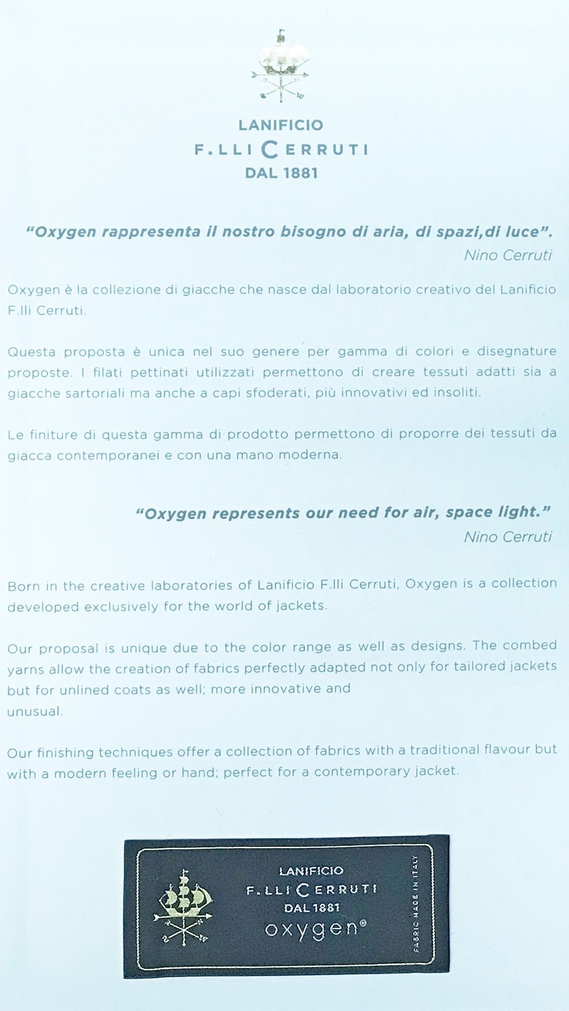 Born in the creative laboratories of Lanificio F.lli Cerruti, Oxygen is a collection developed exclusively for the world of jackets.