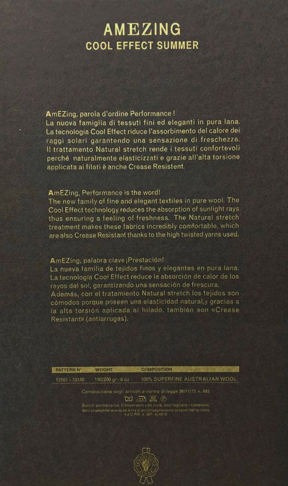 The new family of fine and elegant textiles in pure wool. The Cool Effect technology reduces the absorption of sunlight rays thus ensuring a feeling of freshness. The Natural stretch treatment makes these fabrics incredibly comfortable, which are also Crease Resistant thanks to the high twisted yarns used.