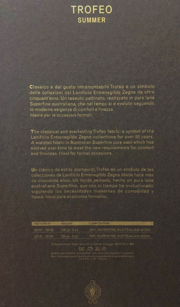 The classical and everlasting Trofeo fabric: a symbol of the Lanificio Ermenegildo Zegna collections for over 50 years. A worsted fabric in Australian Superfine pure wool which has evolved over time to meet the new requirements for comfort and fineness. Ideal for formal occasions.
