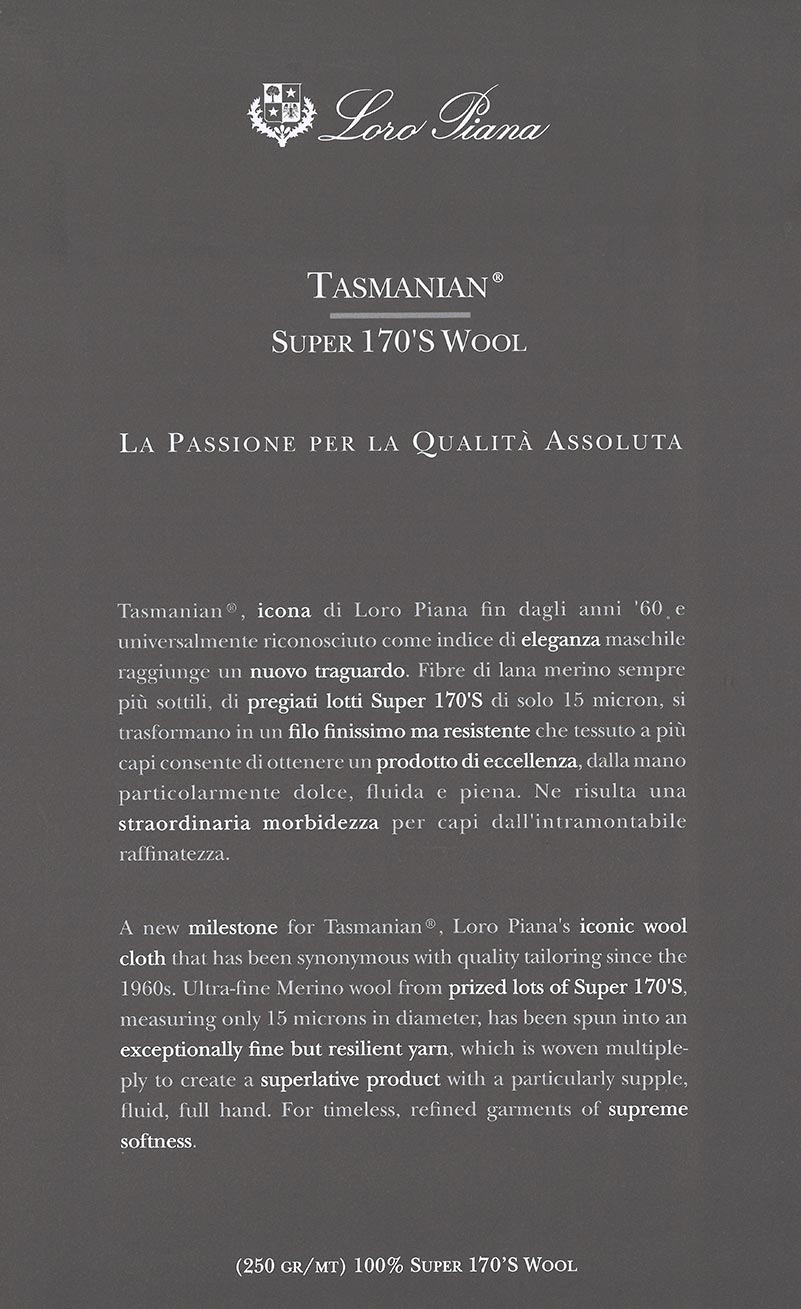 A new milestone for Tasmanian®, Loro Piana’s iconic wool cloth that has been synonymous with quality tailoring since the 1960s. Ultra-fine Merino wool from prized lots of Super 170’S, measuring only 15 microns in diameter, has been spun into an exceptionally fine but resilient yarn, which is woven multiple-ply to create a superlative product with a particularly supple, fluid, full hand. For timeless, refined garments of supreme softness.